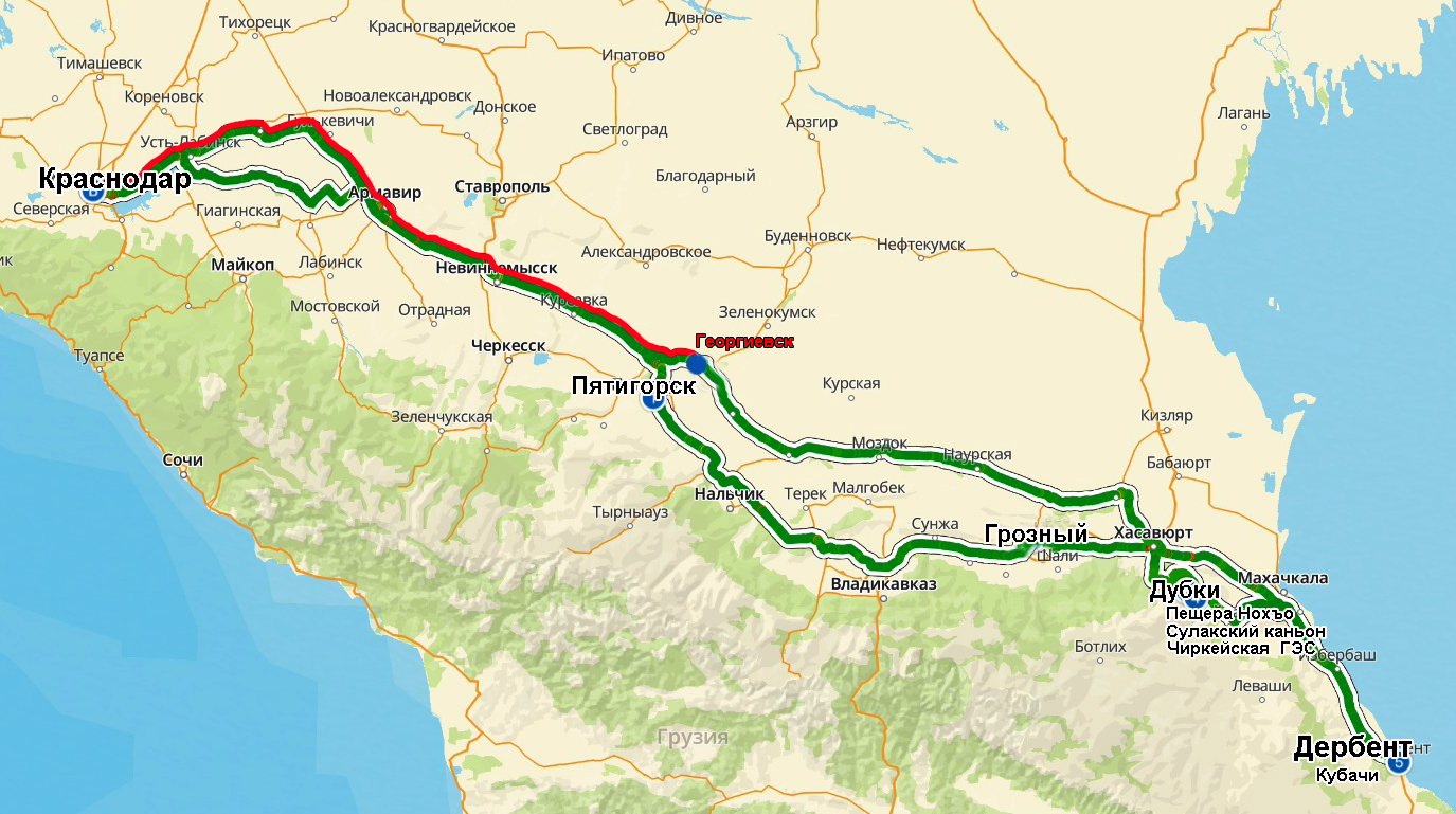 2087 км, 9 дней, 1287 фото, т.е. 143 фото/день Краснодар – Пятигорск - Грозный – Дубки – Пещера Нохъо – Сулакский каньон – Чиркейская ГЭС – Дербент – Цитадель Нарын-Кала – Кубачи – Лунь – Георгиевск (Небольшая поломка и далее на буксире) – Краснодар. |