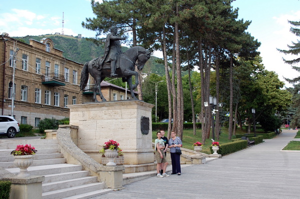 Наша прогулка по Пятигорску началась со сквера, в котором 11 сентября 2010 года был открыт памятник А.П.Ермолову. Алексей Петрович Ермолов (1777‑1861) – военачальник и государственный деятель Российской империи, дипломат, участник Наполеоновских и Кавказской войн, генерал от инфантерии с зачислением по артиллерии. Генерал от инфантерии – пехотный генерал, один из высших воинских чинов в Вооружённых силах Российской империи. «Инфантерия» (Infanterie) в переводе с французского означает «пехота». Автор памятника – Р.Р.Юсупов, который создал множество скульптур и фонтанов в городе Пятигорске. Во время работы над этим памятником скульптор сломал правую руку и выполнял работу левой рукой. В качестве образца московский скульптор использовал портрет Алексея Петровича Ермолова из Эрмитажа работы английского живописца Джорджа Доу, часть жизни работавшего в Санкт-Петербурге. В 1819 году Доу отправился в путешествие по Европе, в ходе которого привлёк внимание российского императора Александра I, который заказал художнику портреты русских генералов, участвовавших в войне с Наполеоном. В 1819-1820 годах Доу написал около 70 портретов героев 1812 года из 332, остальные написаны в соавторстве с другими художниками. Готовый портрет генерала Ермолова был принят в Эрмитаж 8 июля 1827 года.