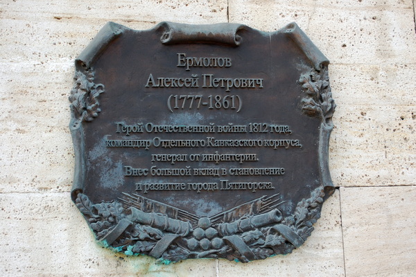 Генерал А.П.Ермолов впервые появился в Пятигорске в мае 1818 года и много сделал для развития города. Благодарные горожане так и написали на монументе: «Ермолов Алексей Петрович (1777‑1861). Герой Отечественной войны 1812 года, командир Отдельного Кавказского корпуса, генерал от инфантерии. Внёс большой вклад в становление и развитие города Пятигорска».