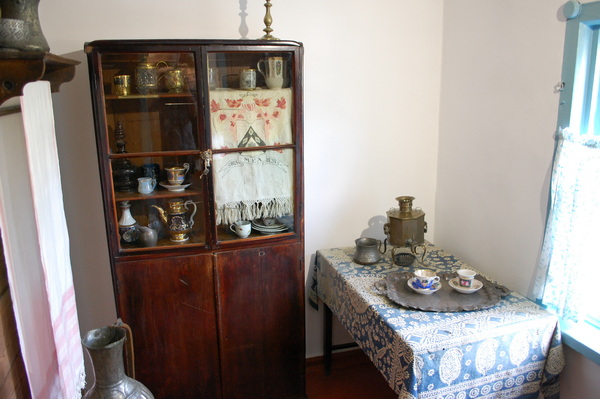 В одной из комнат выставлены складной походный самовар, принадлежавший Лермонтову молочник, полотенце с гербом рода Лермонтовых, поднос, которым пользовались в домике.