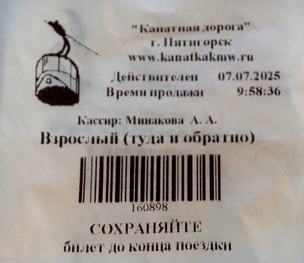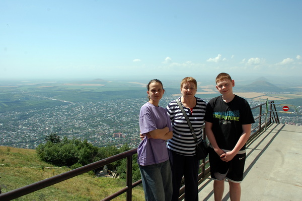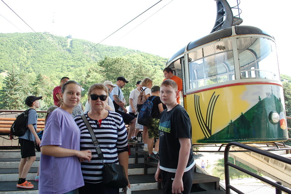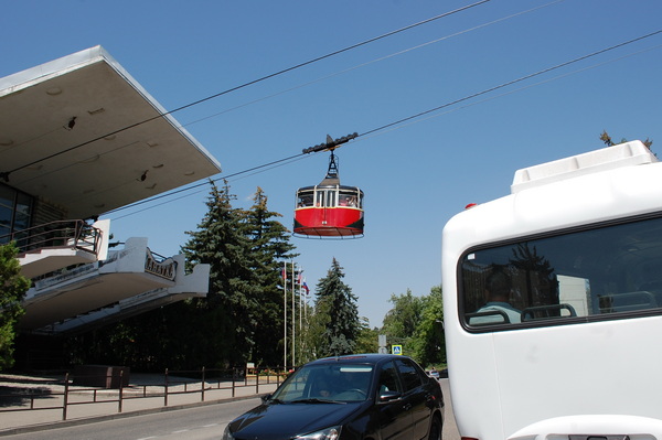 На следующее утро мы решили подняться на гору Машук и посмотреть на город с высоты 994 метра - именно такая высота Машука. На ней установлена 113-метровая телевышка. На гору можно подняться самостоятельно, тропа не очень крутая. Но мы из-за жары не решились на пеший подъем, а воспользовались канатной дорогой.