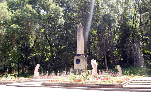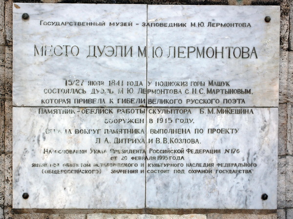 В октябре 1915 г на месте дуэли был установлен памятник. Высокий обелиск выполнен из кисловодского песчаника по проекту скульптора Б.Микешина. Немного позднее вокруг обелиска была поставлена ограда, выполненная по проекту инженеров Л.Дитриха и В.Козлова. Бетонные грифы украшают ограду по четырем углам, соединенным железными цепями.