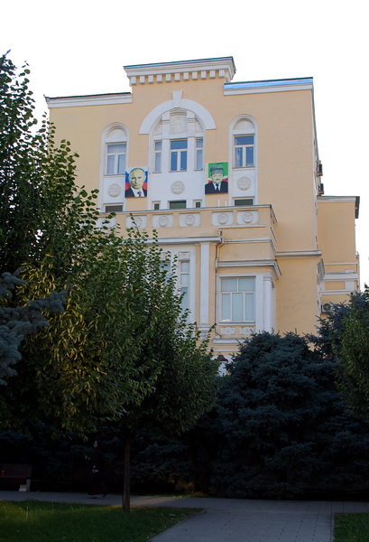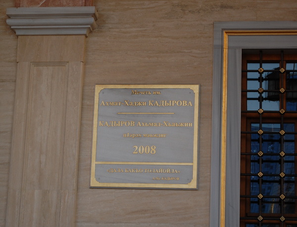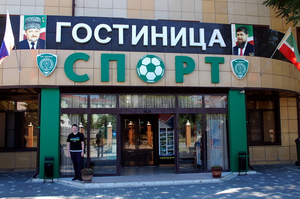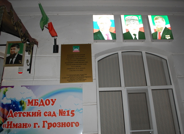 В Чечне мы обратили внимание на множество портретов Путина В.В., Кадырова А.А. и Кадырова Р.А., расположенных не только на административных зданиях, но и в самых неожиданных местах. Как правило, портреты размещены на арках при въезде в города. А также на фасаде детского сада, что очень нас удивило.