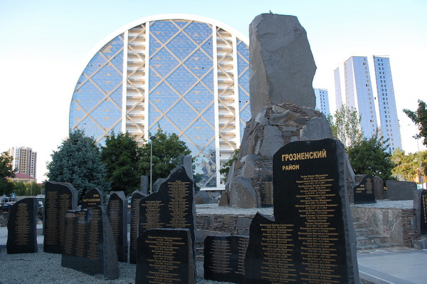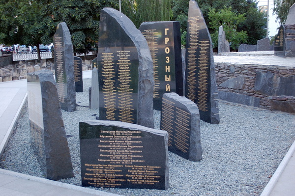 Памятник в центре Грозного был открыт 9 мая 2010 года на площади Ахмата Кадырова. Впоследствии был перенесён на своё нынешнее место – близ мэрии Грозного. Ансамбль состоит из 38 чёрных камней неправильной формы. На отполированной стороне каждого камня высечены написанные золотом имена погибших в ходе контртеррористической операции в Чечне: милиционеров, представителей духовенства, глав администраций населённых пунктов Чечни. В состав мемориала входят также пять камней, на которых высечены имена офицеров и всадников Чеченского конного полка, участвовавшего в Первой мировой войне.