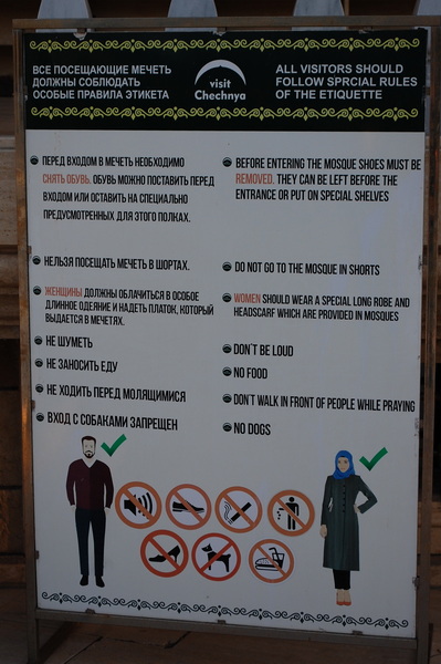 Женщинам необходимо посещать мечеть в одежде, закрывающей руки и ноги, на голове должен быть платок или хиджаб. Мужчинам желательно надеть пиэс – шапочку-тюбетейку с маленькой кисточкой – и строгую одежду. Если платка или тюбетейки нет – их можно взять в мечети на время.