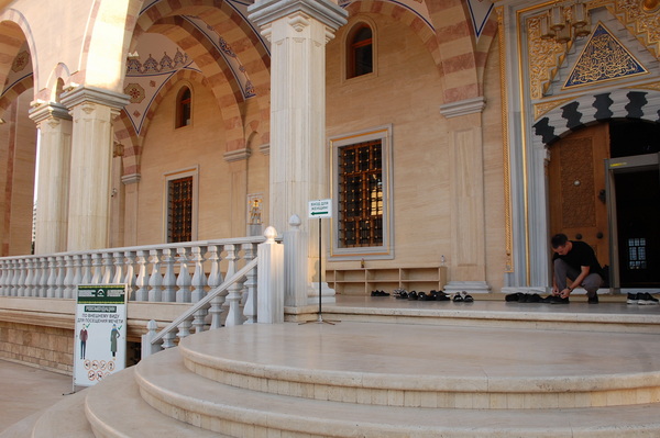 Перед входом в мечеть надо снимать обувь. Её можно взять с собой в пакете или оставить на специально предусмотренных для этого полках.