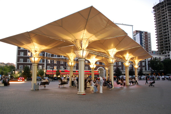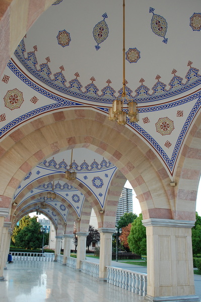 Малые купола установлены на световых барабанах с арочными окнами, дающими внутреннему пространству дневной свет. Общая площадь мечети – 5000 кв. м. Прилегающее пространство по периметру ограждено арочными галереями, которые образуют внутренний двор. Под арками установлены мраморные скамьи, в центре – фонтан для омовений перед молитвой.