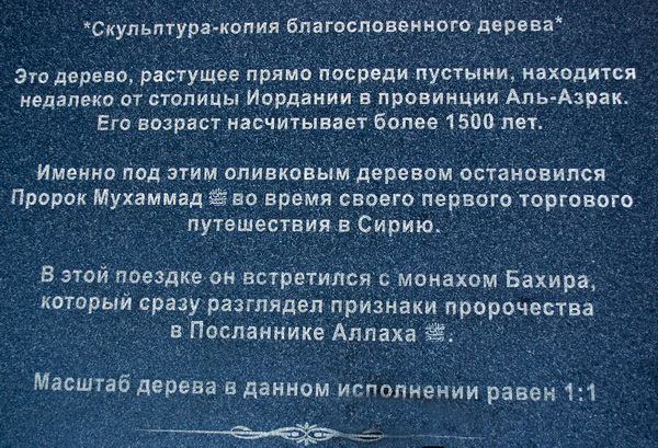 Перед мечетью «растёт» огромное оливковое дерево. Это искусственная копия оливкового дерева из Иордании, под которым молился и отдыхал пророк Мухаммед.
