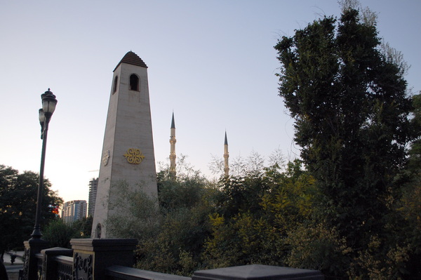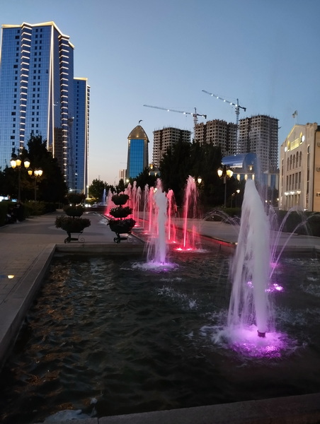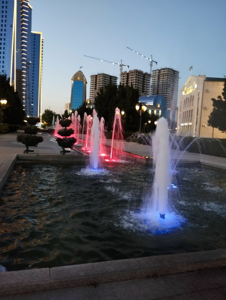 Фонтан «Бегущая волна» Площадь перед мечетью «Сердце Чечни» украшает необычный фонтан – одна из самых популярных достопримечательностей города. Несколько узких прямоугольных бассейнов выстроились в одну линию длиной 180 м. «Бегущая волна» приводится в действие благодаря 175 насосам. Особенно красиво падающие струи смотрятся в яркой вечерней подсветке, когда включаются 250 светодиодных прожекторов на дне бассейна, непрерывно меняющих цвета, подсвечивающих фонтан разными оттенками. Под музыку 120 струй исполняют «танец». Самая впечатляющая композиция – бегущая волна, когда пенящаяся вода вздымается на 3,5 метра. Фонтан включается 5 раз в день – за полчаса до призыва муэдзина на молитву и перестает работать спустя полчаса.