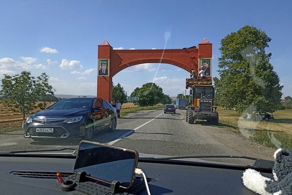 В Чечне на въездах в города или выездах построены арки с портретами В.В.Путина, А.Кадырова и Р.Кадырова.