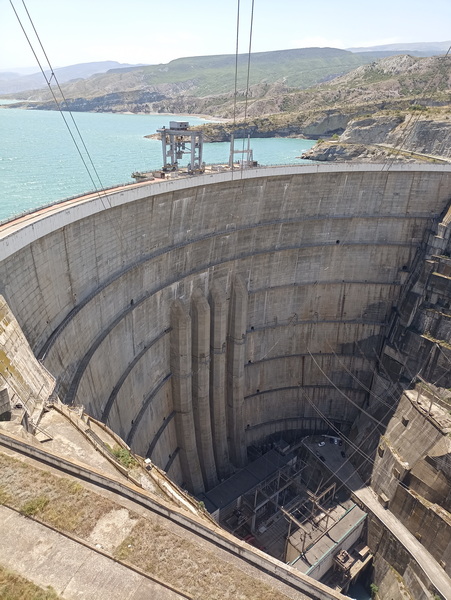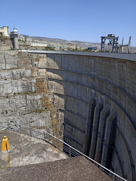 Год начала строительства ГЭС – 1964. Год ввода в эксплуатацию первого гидроагрегата – 1974. Установленная мощность – 1000 МВт. Состав сооружений: арочная плотина, приплотинное здание ГЭС с двухрядным расположением гидроагрегатов, эксплуатационный туннельный водосброс. После тщательной сверки документов каждый участник получает персональную карту гостя, жилет и каску.